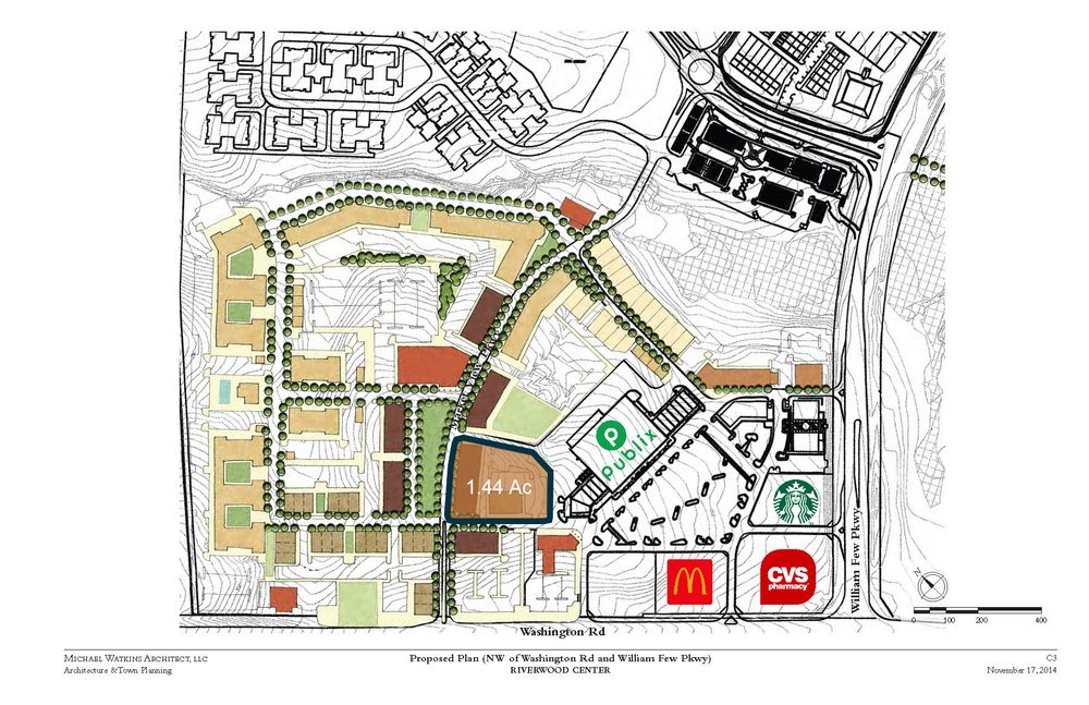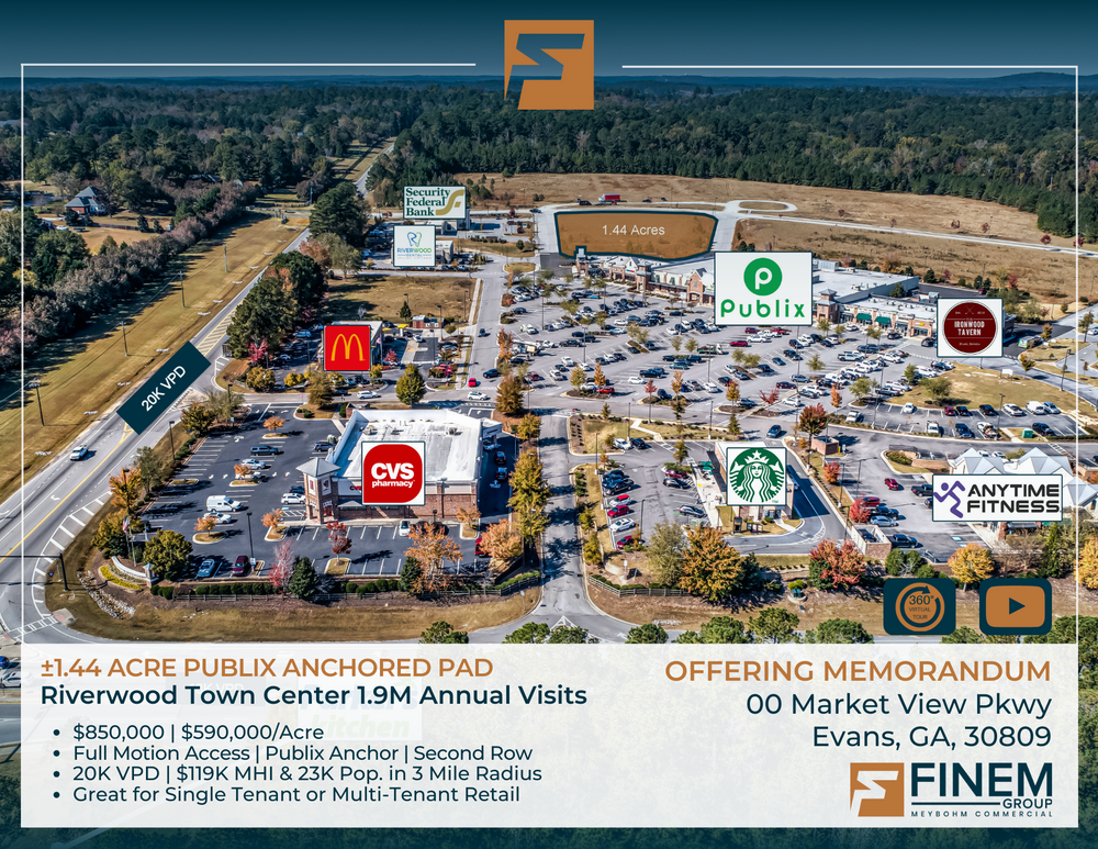 The Finem Group at Meybohm Commercial is proud to exclusively present this prime 1.44-acre commercial land parcel for sale. Situated in the heart of Evans, Georgia, this second-row retail pad, anchored by Publix at Riverwood Town Center, boasts 1.9 Million annual visitors making it in the 89th percentile in the United States for neighborhood centers according to Placer AI. This site benefits from exceptional demographics with a Median HHI of $119K and a population of 23K within a 3 mile radius. This property is currently zoned PUD (Planned Urban Development) and has utilities on site. The property is in line with Publix and would make for an ideal single-tenant retail development or a multi-tenant strip center. Riverwood Town Center features a strong national tenant mix with users like Publix, McDonald's, Starbucks, CVS, Parker’s Kitchen, and Papa Johns. On Washington Rd there is over 29K VPD with another 15K VPD on William Few Pkwy.