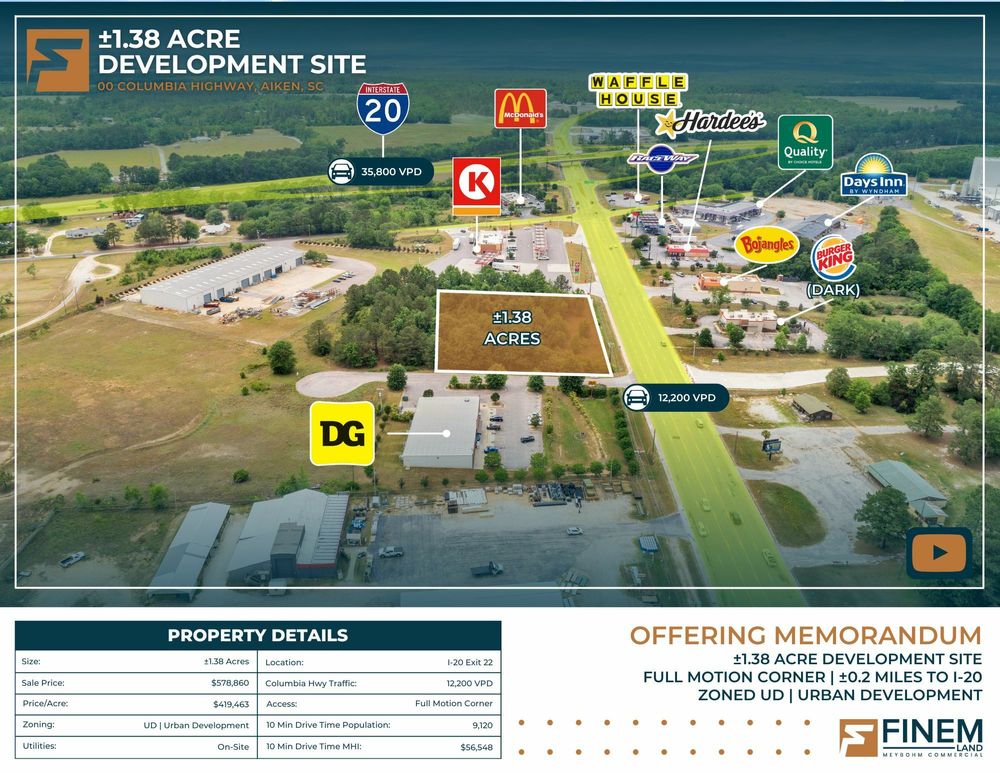 Meybohm Commercial is pleased to exclusively present this ±1.38-acre corner parcel located at the intersection of Columbia Highway (US-1) and Harvey Court in Aiken, South Carolina. This highly visible commercial site offers full-motion access and exposure to over 12,200 vehicles per day along Columbia Highway. Zoned UD (Urban Development), Aiken County’s broad commercial designation, the site accommodates a wide range of retail and service-oriented uses, including QSRs, coffee shops, oil change operators, and more. Strategically positioned along a growing commercial and industrial corridor, the property serves as a gateway to Aiken’s northwestern industrial zone. It is situated just minutes from I-20 and in close proximity to Aiken Regional Airport and major regional employers such as Shaw Industries, which is actively expanding its nearby operations—further reinforcing long-term demand in the area. Surrounding the site are established national brands including Dollar General, Bojangles, and Circle K, providing a steady draw of consumer traffic. The property is supported by favorable demographics, with a 3-mile median household income exceeding $81,000 and a 10-minute drive-time population of over 9,000, making it an attractive opportunity for retail infill or owner-user development.