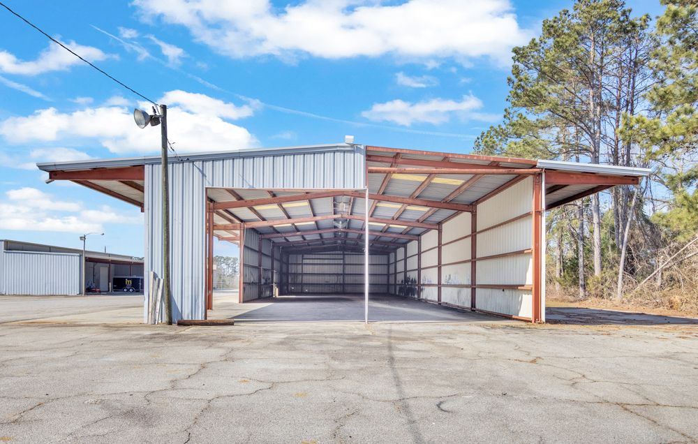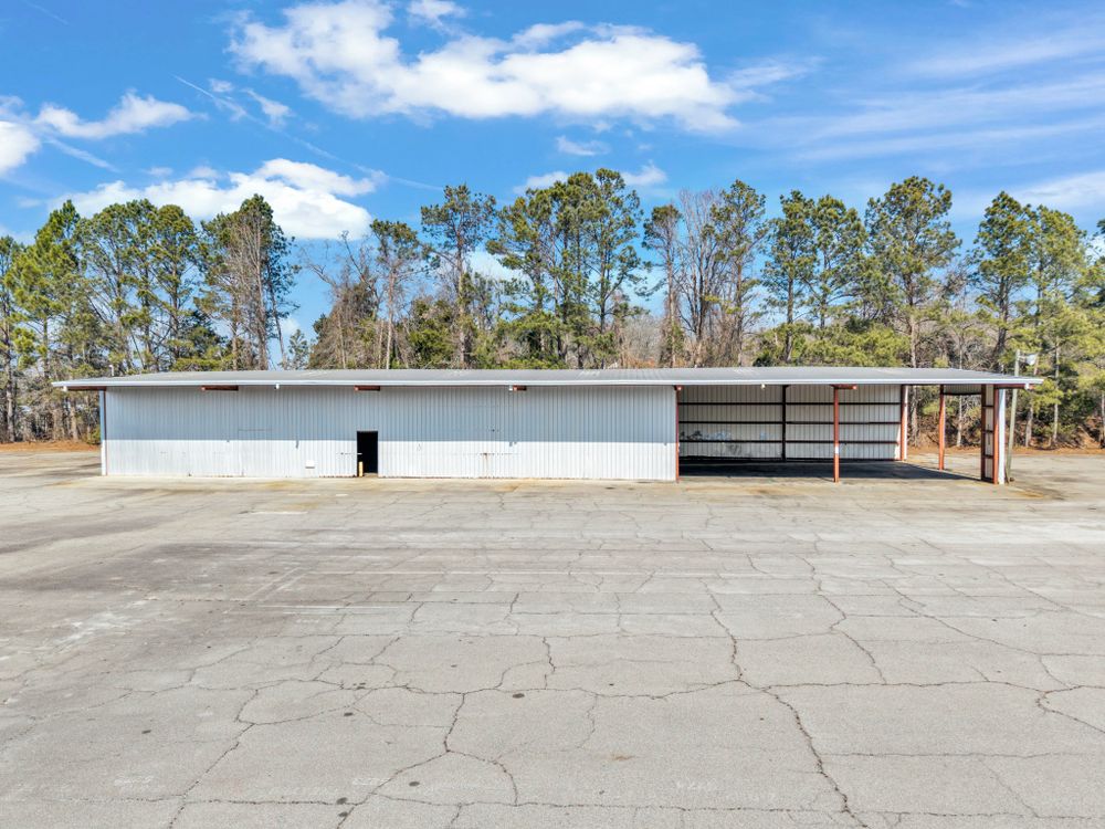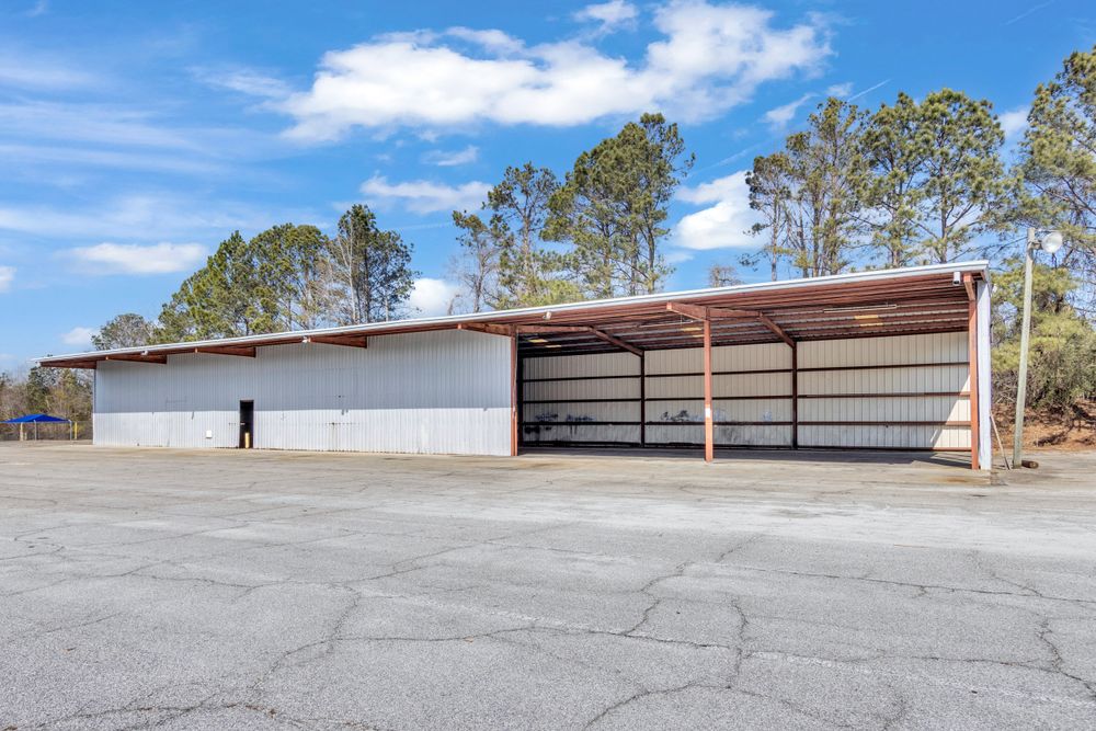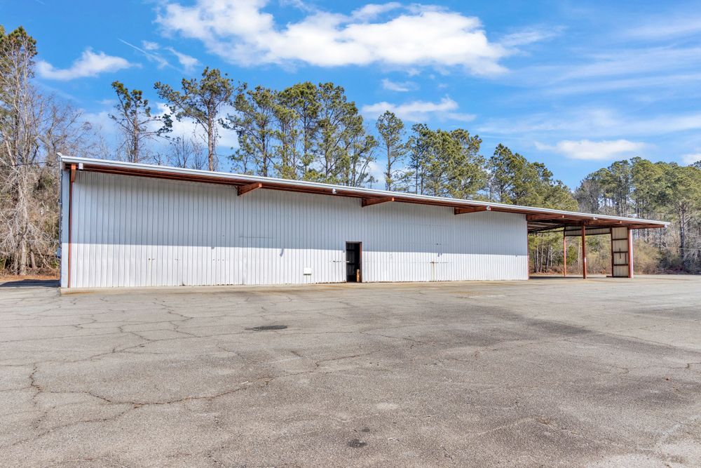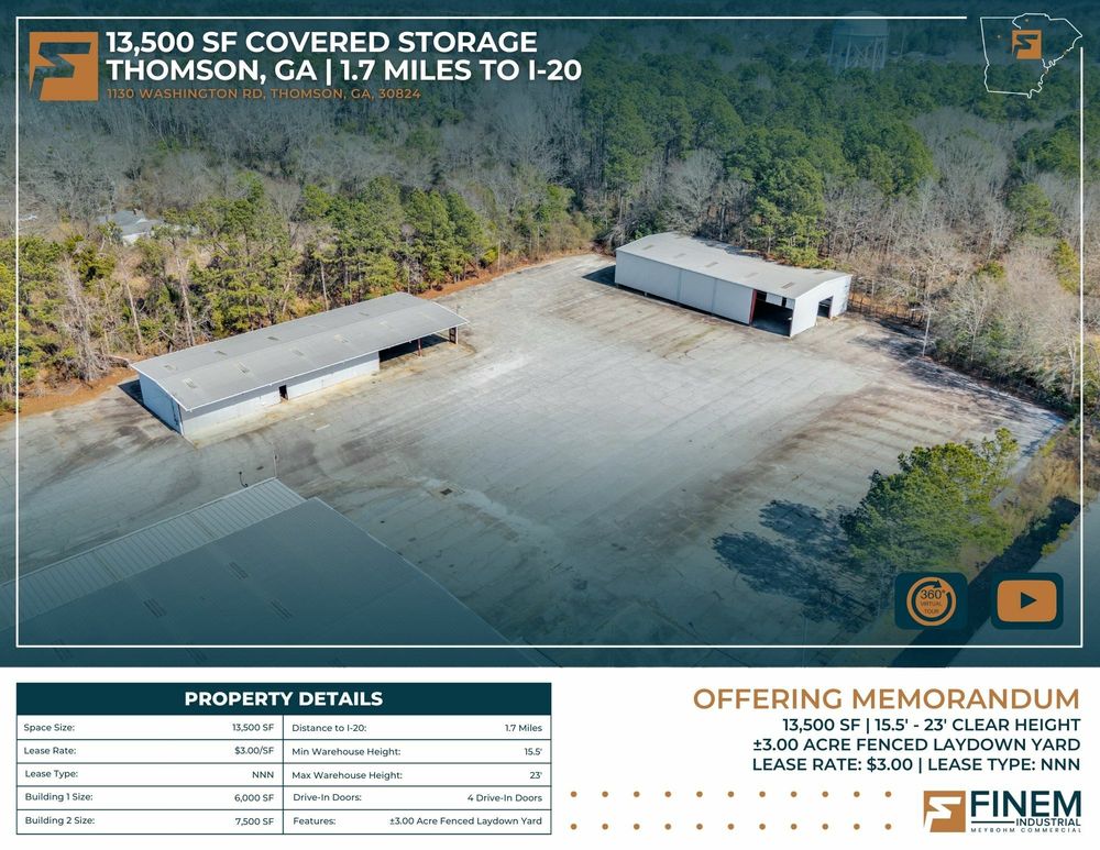 The Finem Group at Meybohm Commercial is pleased to exclusively present 1130 Washington Road in Thomson, Georgia for lease. This ±13,500 square foot covered storage opportunity consists of two separate warehouse structures totaling approximately 6,000 SF (Building 1) and 7,500 SF (Building 2), situated on approximately 3.0 acres of fenced laydown yard. Building 1 (front structure) measures approximately 40 feet wide by 150 feet long and features clear heights of approximately 15.5 feet at the eaves and 17.5 feet at the center. The structure provides covered storage with a partially enclosed configuration suitable for equipment, materials, or fleet staging. Building 2 (rear structure) measures approximately 60 feet wide by 125 feet long and offers approximately 20.75 feet clear height at the eaves and 23 feet at the center. This building features open-span construction with fluorescent lighting throughout, providing an efficient layout for larger equipment storage. Access to a loading dock attached to the adjacent church building is available for tenant use. While the church building itself is not included in the lease offering, tenants will have the ability to utilize the loading dock. The gated yard provides additional secured outdoor storage capacity, making this property well suited for contractors, service-based businesses, and operators requiring a combination of covered storage, yard space, and dock access.