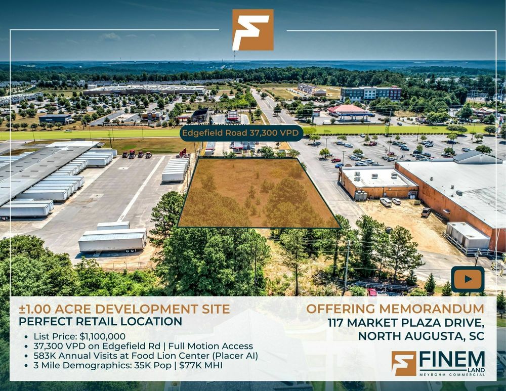 The Finem Group at Meybohm Commercial is proud to present this ±1.00-acre retail site located on Market Plaza Drive in North Augusta, SC. This site, situated in a rapidly expanding retail hub, benefits from its strategic position that would allow for full motion access on Edgefield Road when Southeasten Freight Lines moves and the land is sold for development, ensuring excellent visibility and accessibility. With a traffic count of 37,300 vehicles per day on Edgefield Road, the site offers a unique opportunity to capitalize on high traffic counts and attract a diverse customer base. The surrounding area is home to numerous national tenants, enhancing the site's appeal for potential retailers. The parcel is currently zoned for Planned Development making it ready for development. This highly visible and accessible ±1.00-acre parcel is positioned on Edgefield Road. With a flat topography, the site is devoid of wetland or floodplain issues, streamlining the development process. The land's characteristics make it an ideal candidate for a wide range of commercial development projects. The parcel’s position that will allow for a full motion entry and exit to the new shopping center is key to making this land highly desirable.