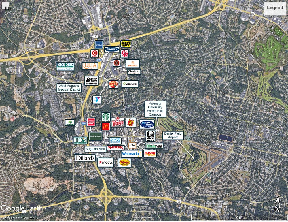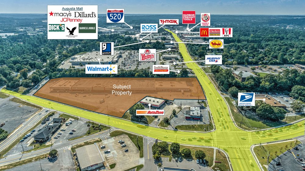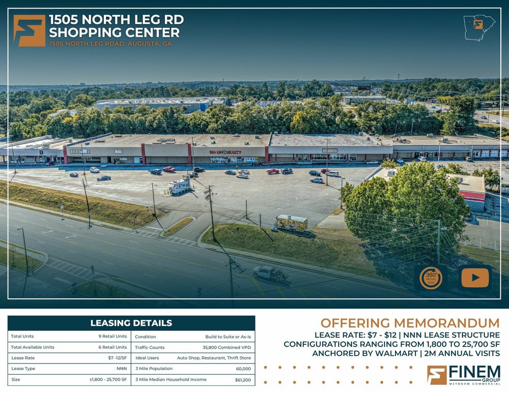 The Finem Group at Meybohm Commercial is proud to exclusively present six spaces for lease in Augusta, GA. The subject property is conveniently located at the corner of North Leg Road and Wrightsboro Road offering connectivity to major transportation thoroughfares. Located in Richmond County and zoned for commercial use, this property would be ideal for any local or national retail business. There is space up to ±25,700 SF and the spaces can be leased as-is or built out for tenants' needs. The build-to-suit option offers flexibility for tenants looking to make a custom space for their business. This property is a multi-tenant shopping center with a total of 9 spaces, of which 5 are available for lease. The property has plenty of parking spots for the patrons visiting the businesses in this strip center. This property has convenient access with Righ-In Right-Out on Wrightsboro Road, and 3 Full Motion Entry and Exit points on North Leg Road. This property is located about 1 mile from Bobby Jones Expy (I-520) making it easily accessible from most parts of the CSRA and expanding the customer reach of this site. This location is surrounded by many national tenants such as Walmart, Autozone, Taco Bell, Walgreens, Subway, Lulu’s Car Wash, and Dollar Tree which demonstrates long term commitment to this trade area.