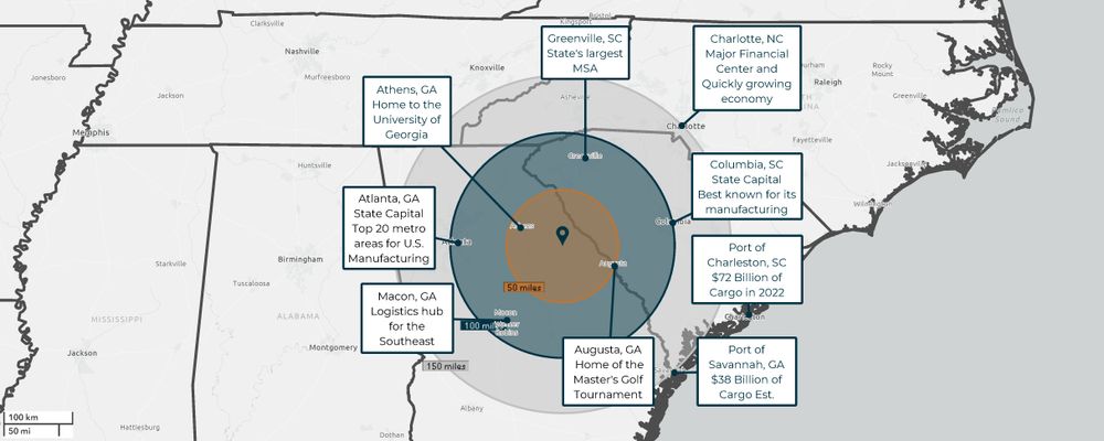 - 15 Miles from I-20, connecting to Atlanta & Columbia