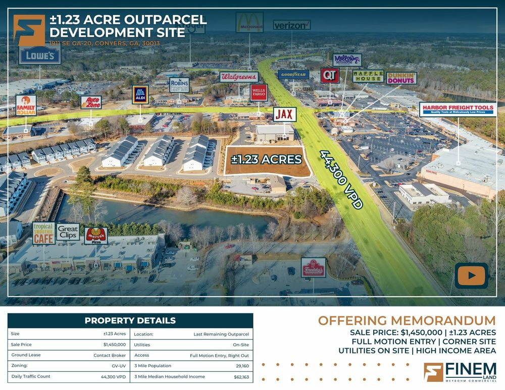 The Finem Group at Meybohm Commercial is pleased to exclusively present this ±1.23-acre development opportunity in Conyers, Georgia. Strategically located on a high-traffic corner on GA-20 this property offers full motion entry and, right-out access and ±200 feet of road frontage, ensuring high visibility and ease of entry. Located across the street from Harbor Freight and to the east of Publix and Target, this property is situated between big-name retailers. With it being one of the last remaining undeveloped out-parcels on GA Hwy 20, this presents an opportunity for a ground-up development on an already existing corridor. In addition, backing up to the property is a brand new, 73-unit, townhome development. This property is zoned GV-UV for Commercial Business, making it ideal for a wide range of commercial uses. Utilities are available on-site, and the property has an existing access road. The property experiences a traffic count of 44,300 VPD on GA-20. Although it is not on a signaled intersection, it does have a turn lane that feeds into a side road that it shares with the Oil Change next door and will also connect to the townhome development. There is also a shared drive in the rear creating inter-parcel connectivity with neighboring properties and access to both GA-20 and GA-138.
