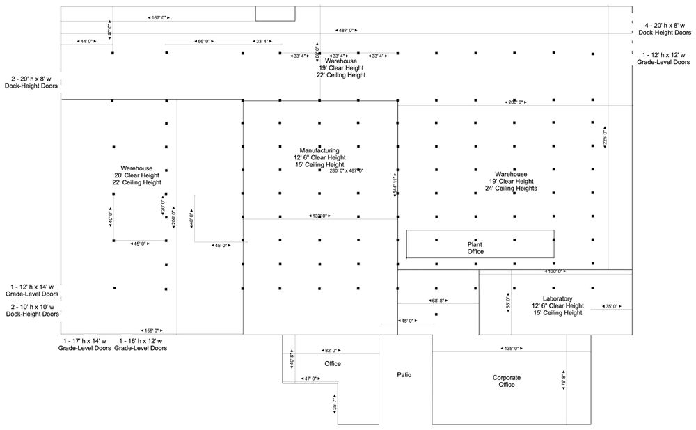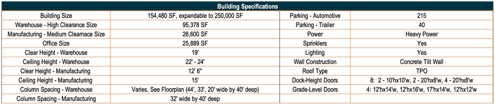 - The 154,000 square foot facility features 24' to 22' foot ceilings