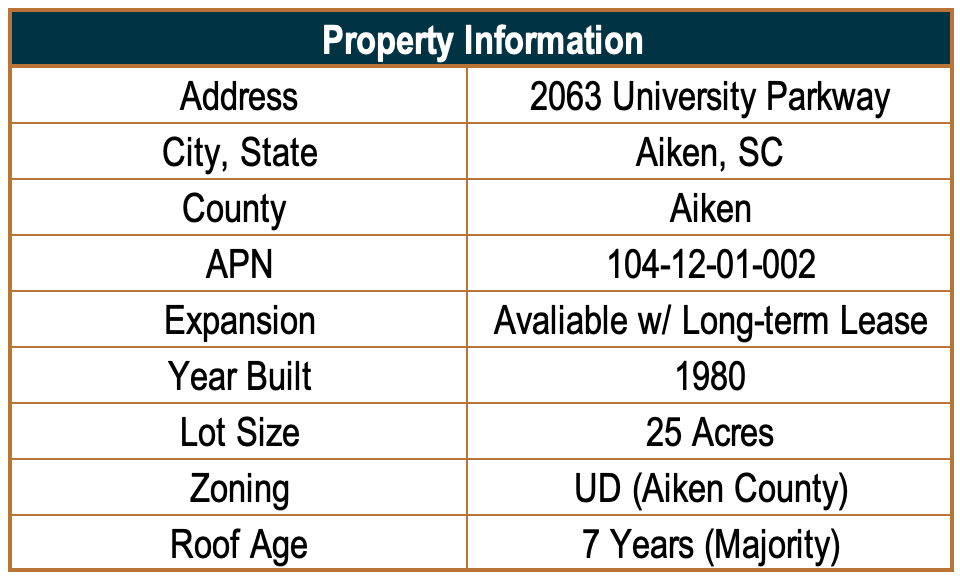 - Located in Aiken, SC on University Parkway (9.7K VPD), just 4.5 miles from I-20