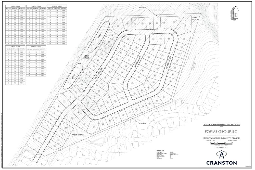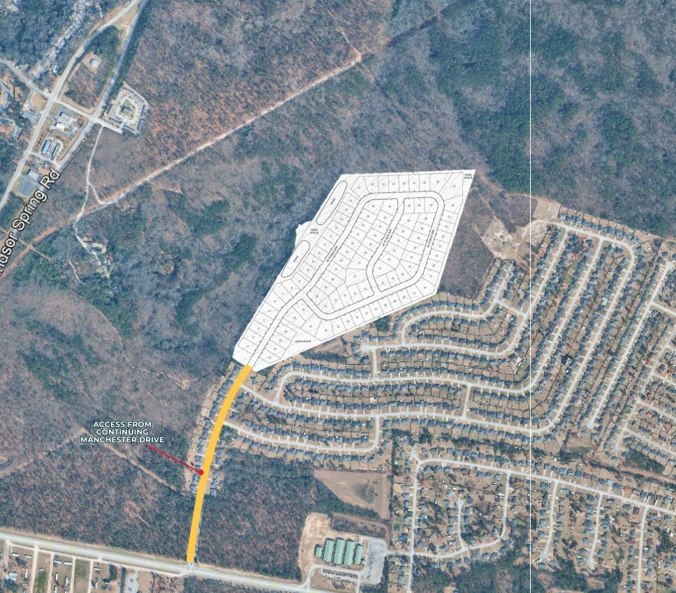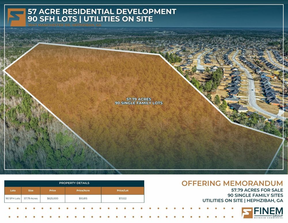 The Finem Group at Meybohm Commercial is pleased to exclusively present 3047 & 3038 Manchester Drive, a ±57.79-acre residential development tract in Hephzibah, Georgia. With R-1 zoning in place and utilities located adjacent to the property, this site offers an excellent opportunity for residential development. A preliminary concept plan outlines 95 residential lots; however, a sewer easement impacts five of the proposed lots, reducing the total number of developable lots to approximately 90. Access to the site will be provided through the extension of Manchester Drive, creating a logical continuation into the planned neighborhood. The tract features gently rolling topography and is positioned directly north of the established Cambridge Subdivision, a community of approximately 300 brick homes. Neighboring an elementary school and within proximity to retail amenities, this parcel is primed for subdivision development with scale.
