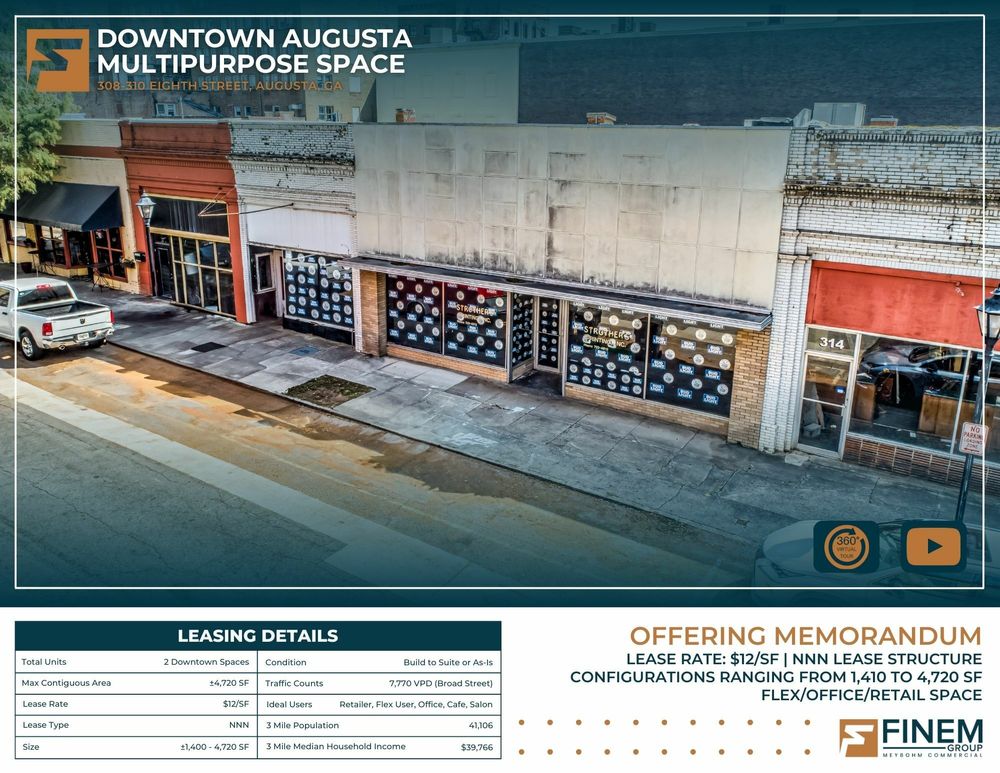 The Finem Group at Meybohm Commercial proudly presents two exclusive Flex/Retail spaces for lease in Downtown Augusta, GA. Ideally positioned just one block from Broad Street—Augusta’s main retail corridor—and adjacent to Greene Street, the primary route in and out of Downtown, this property offers exceptional convenience and visibility. Located in Richmond County and zoned for commercial use, these spaces offer versatile leasing options: tenants can lease as-is or opt for a build-to-suit layout tailored to specific business needs. 308 Broad Street: This ±1,410 SF unit includes a welcoming lobby/showroom at the entrance, leading into a similarly sized space suitable for office, retail, or storage use. A smaller room in the rear can serve as additional storage or a private office. 310 Broad Street: A larger unit featuring a spacious main room with a central divider, multiple small storage closets, and two sizable office or storage areas adjacent to the retail floor. (Refer to page ___ for a detailed floor plan.) These two spaces offer some flexibility in size as they can be leased together or as two separate units. Ideal for client-facing businesses, these spaces suit a variety of uses, including a restaurant, coffee shop, barbershop, professional office, or local retail store. Located near numerous restaurants, entertainment venues, and a hotel, these spaces are prime choices in a vibrant downtown setting.