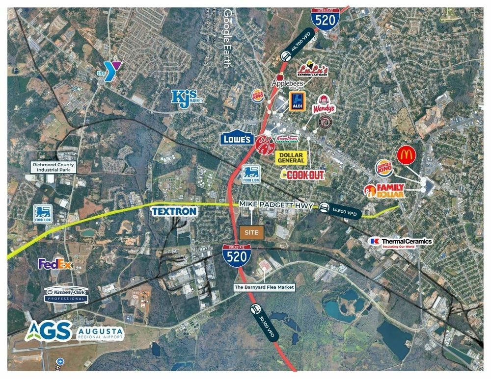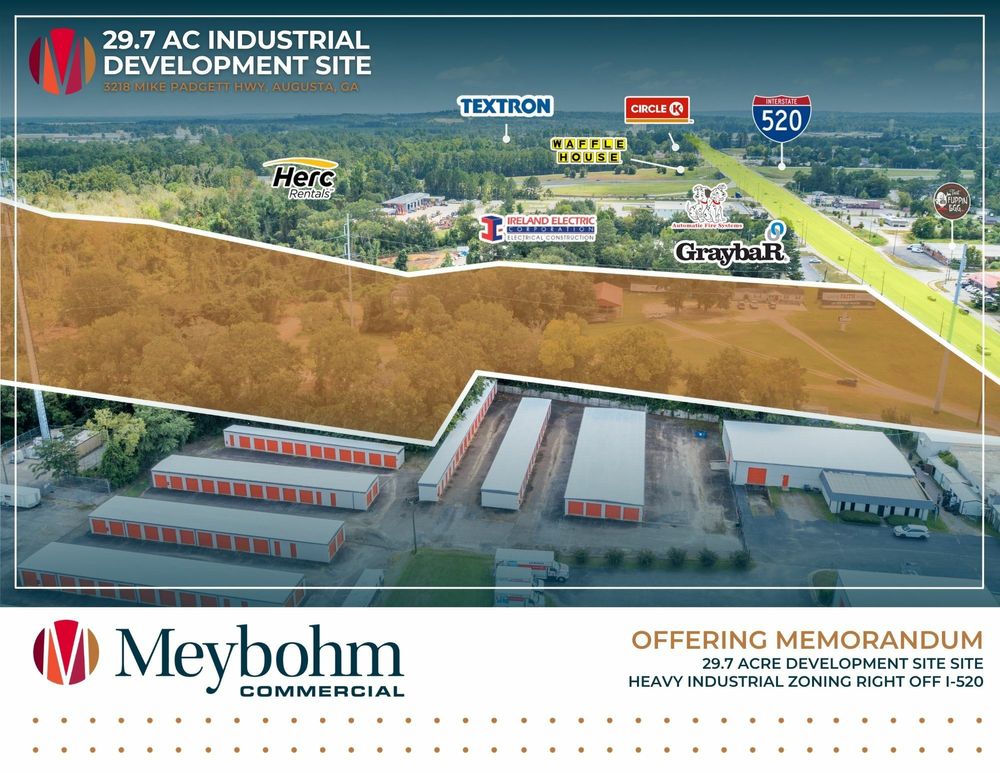 Meybohm Commercial is pleased to exclusively present ±29.70 acres of industrial land located along Mike Padgett Highway in Augusta, Georgia. Zoned HI (Heavy Industrial), the property allows for a wide range of industrial and manufacturing uses without the need for rezoning. The site includes an existing ±1,800-square-foot office building and a detached canopy shed, providing immediate utility for operational users or staging. Full-motion access is available directly on Mike Padgett Highway, and the site is positioned just 0.4 miles from Interstate 520 (Bobby Jones Expressway), offering direct connectivity to I-20, the Augusta Regional Airport, and Southeastern logistics routes including the Ports of Savannah and Charleston. All major utilities are available onsite. Traffic counts exceed 14,800 vehicles per day (VPD) along Mike Padgett Highway and over 30,000 VPD on I-520, supporting strong regional access and visibility.