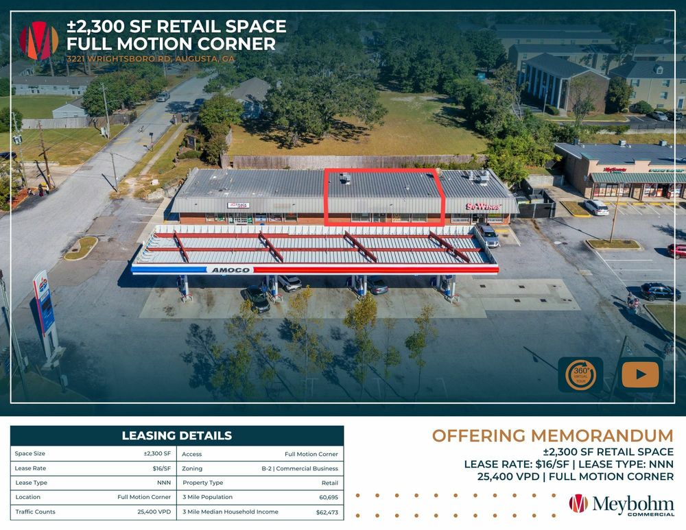 The Finem Group at Meybohm Commercial is pleased to exclusively present ±2,300 square feet of vanilla shell retail space at 3221 Wrightsboro Road in Augusta, Georgia for lease. This interior unit, previously outfitted for restaurant use, includes an in-place vent hood and is situated within a multi-tenant center. The flexible configuration is ideal for quick-service restaurants, beverage concepts, or retail users seeking a move-in ready platform to build out their brand.