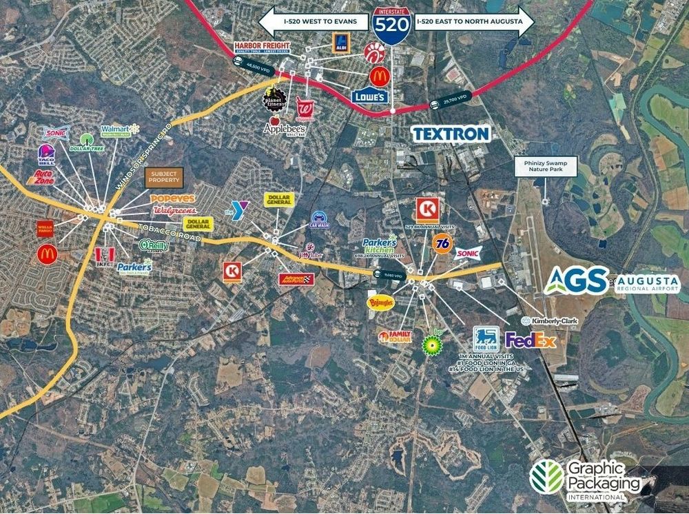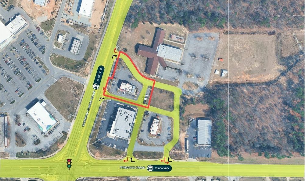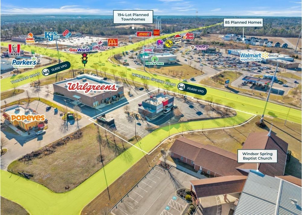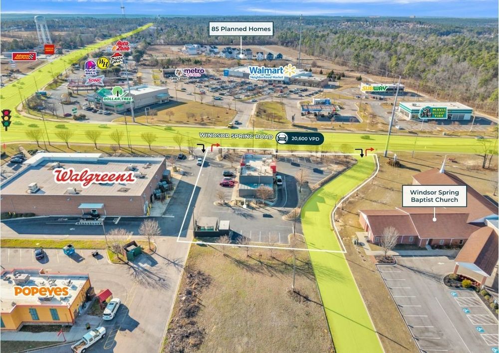 The Finem Group at Meybohm Commercial is pleased to exclusively present 3696 Windsor Spring Road in Hephzibah, Georgia, a vacant quick service restaurant (QSR) opportunity located within one of South Augusta’s most active retail nodes. The property includes a 3,000-square-foot restaurant building constructed in 2016, situated on 0.99 acres and designed with a functional drive-thru layout. The site benefits from two right-in/right-out access points along Windsor Spring Road, a right-in/right-out access point on Tobacco Road, and a ¾ access on Tobacco Road allowing efficient customer and delivery circulation. The location sits adjacent to a Neighborhood Walmart and is surrounded by national retailers including McDonald’s, Taco Bell, Popeyes, and Parker’s Kitchen, creating strong retail synergy. Traffic counts reach 20,600 vehicles per day on Windsor Spring Road and 13,600 vehicles per day on Tobacco Road, providing strong visibility.