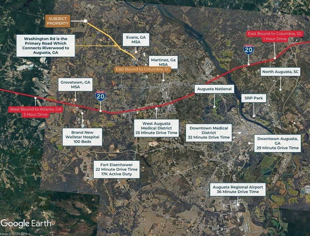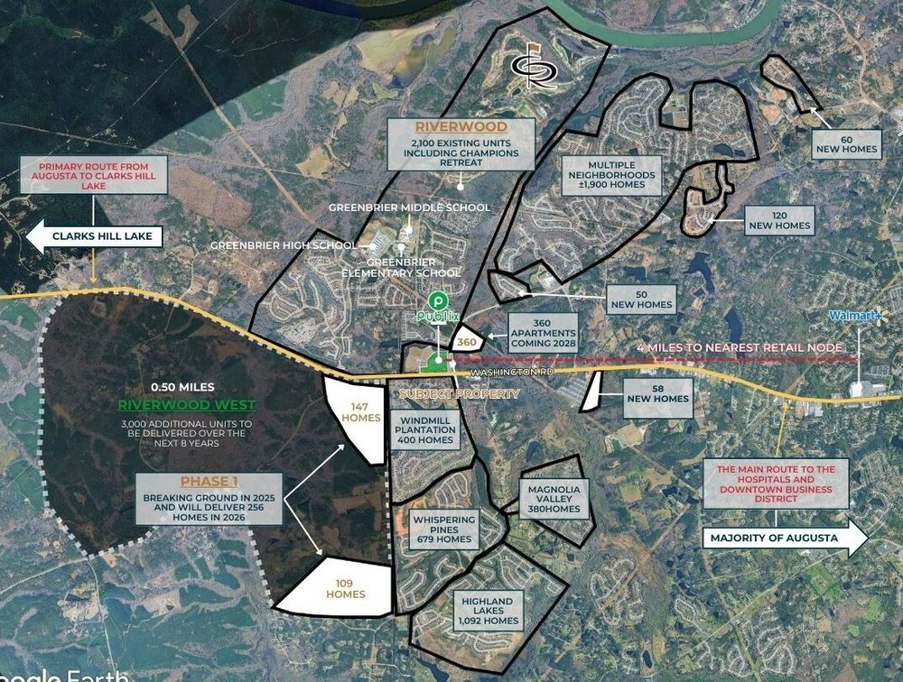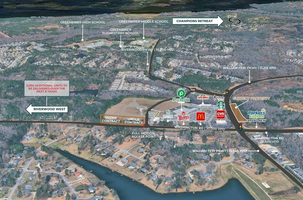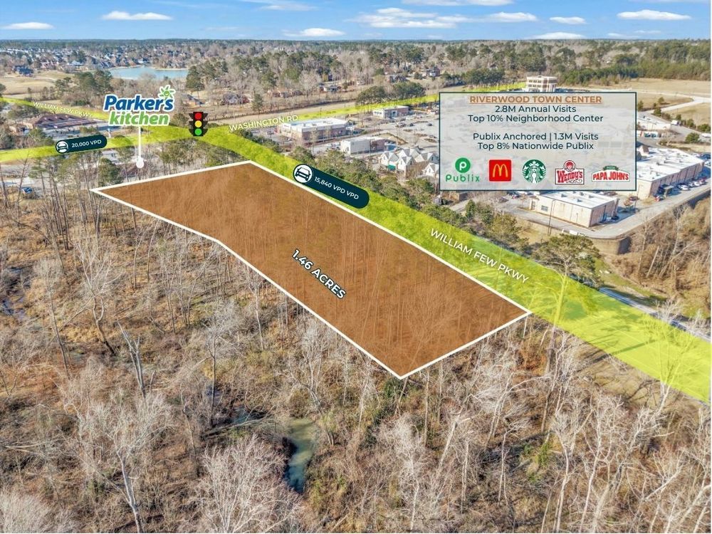 The Finem Group at Meybohm Commercial is pleased to exclusively present 5095 Washington Road in Evans, Georgia for sale. This ±1.46-acre commercial land parcel is zoned PUD and allows for a variety of commercial uses. Positioned adjacent to the signalized intersection of Washington Road and William Few Parkway, the property offers strong visibility and accessibility in one of Columbia County’s most established and growing corridors. The site may be sold as a single commercial tract or subdivided and sold seperately. The site is located directly across from Riverwood Town Center and adjacent to a newly constructed Parker’s Kitchen. Water and sewer are available along William Few Parkway, providing utility access to support future development. A small portion of the site is impacted by flood zone areas, with the majority of the acreage remaining developable. The property benefits from planned full-motion access on William Few Parkway, with Parker’s constructing an internal roadway that will further enhance connectivity and site functionality. With approximately 100 feet of frontage and a strategic position within the Riverwood trade area, this parcel presents an opportunity for retail, service, medical, or specialty commercial users seeking presence in a high-income submarket.