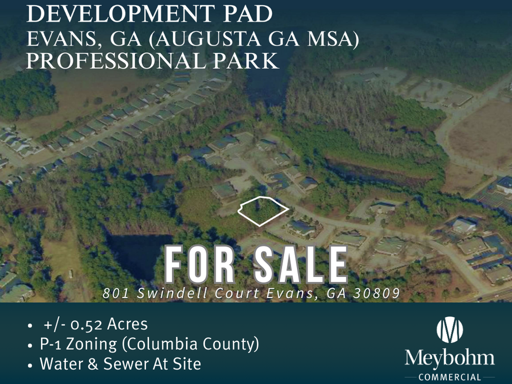 Meybohm Commercial Properties exclusively presents this well-positioned 0.52 acre professional development pad. Strategically located at 801 Swindell Court, sitting in the heart of Columbia County and on a corner lot within the established professional development featuring a synergistic mix of users. Zoned P-1 (Columbia County), offering a multitude of opportunities for an end-user or investor. Allowable building footprint up to 4,000 SF, accommodating multiple points of ingress/egress available, with ample parking of +/- 20 parks.
