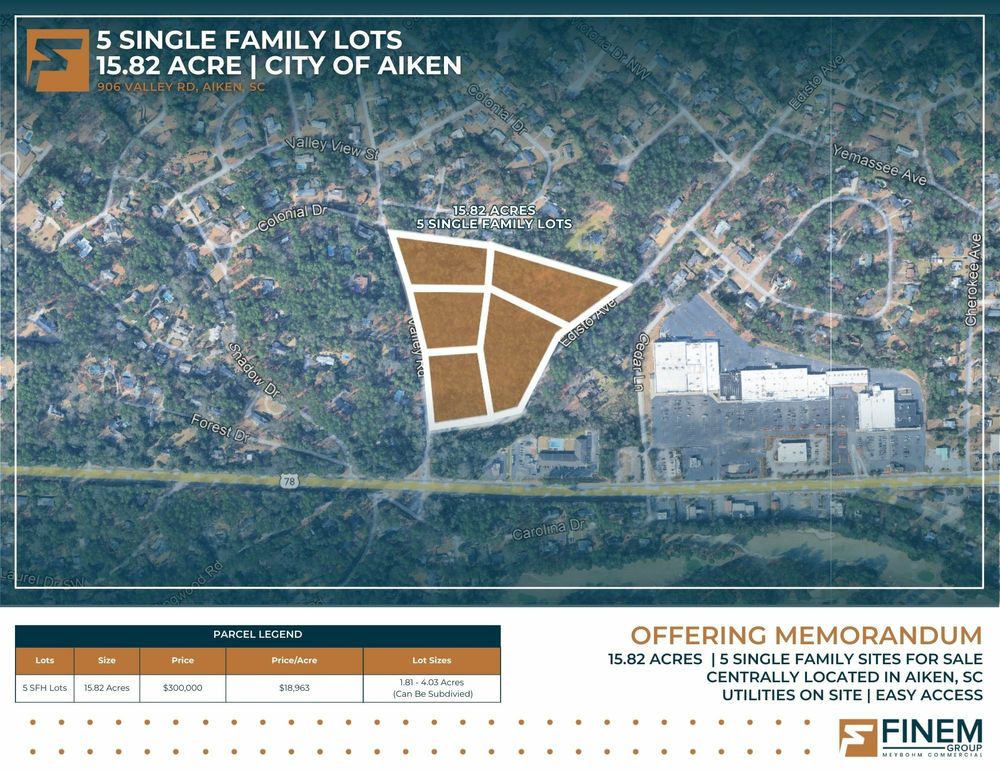 The Finem Group at Meybohm Commercial is pleased to exclusively present 15.82 acres at 906 Valley Rd in Aiken, SC. Zoned RC and subdivided into five large single-family residential lots, this property offers a strategic opportunity for infill development in a well-connected area of Aiken. With access to public utilities at the street and gentle elevation changes across the site, the lots are ideal for new home construction. This listing represents a rare opportunity to acquire residential land in an established corridor with close proximity to regional employers, healthcare, and downtown Aiken.