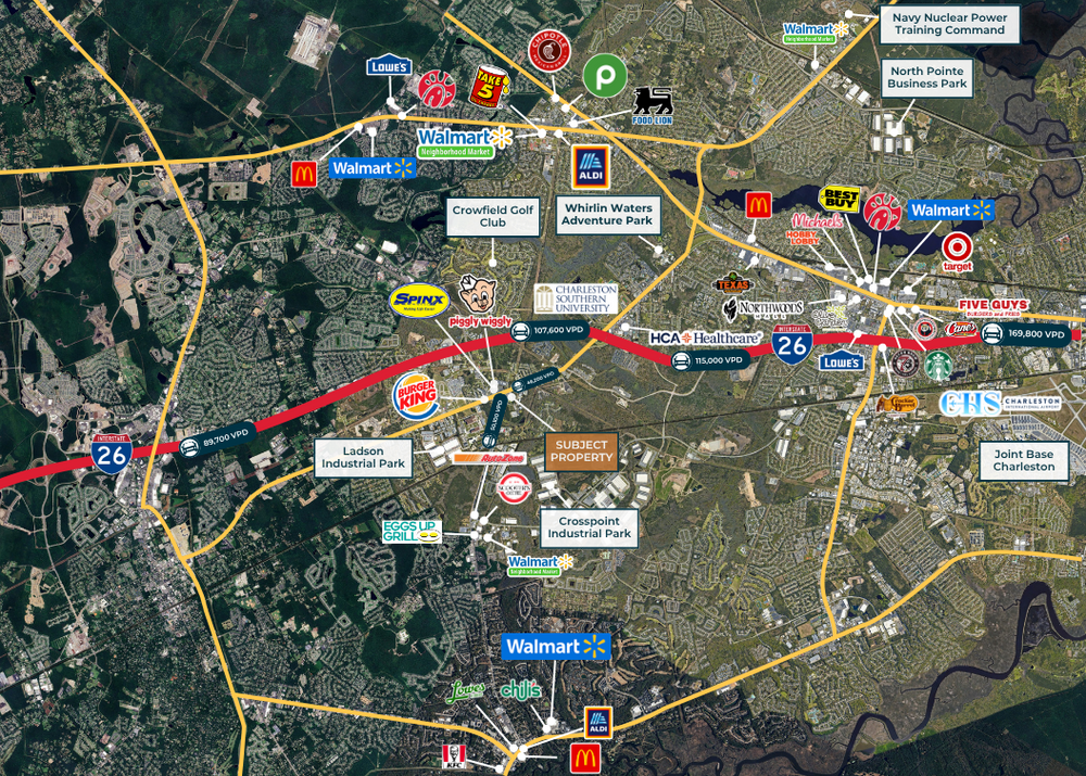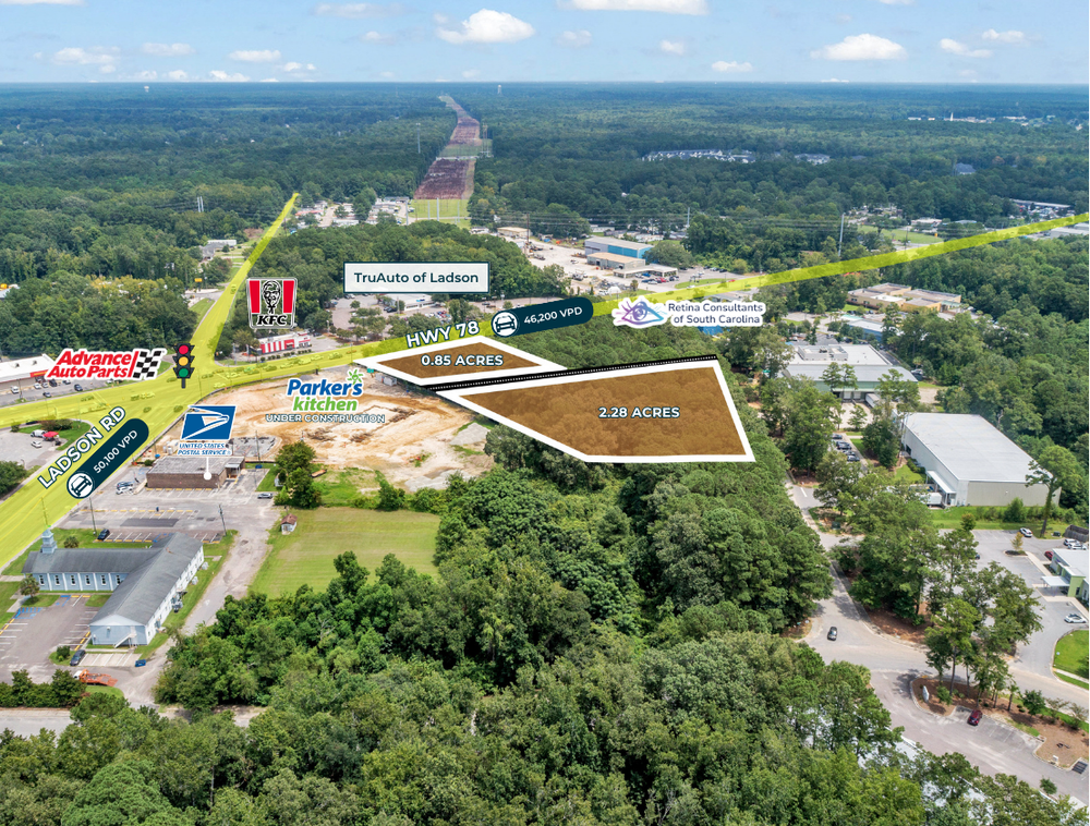 The Finem Group at Meybohm Commercial is pleased to exclusively present 9581 Hwy 78 in Ladson, South Carolina. This 3.13-acre site is divided into two distinct parcels: a ±0.85-acre front pad ideal for retail, and a ±2.28-acre rear pad suited for industrial oriented development. Pad 1 features direct frontage on Hwy 78 with daily traffic counts exceeding 47,000 vehicles. The site offers full-motion shared access through Parker’s Kitchen, creating strong visibility and immediate traffic synergy. Its layout and location make it well-positioned for national QSR brands, drive-thru coffee operators, oil change centers, and other small-format retail users. Pad 2 sits behind the retail parcel and offers scale and configuration ideal for warehouse, flex, or service uses. Its depth, second-row positioning, and access from Commercial Drive make it a logical fit for users seeking industrial proximity within a growing suburban corridor.