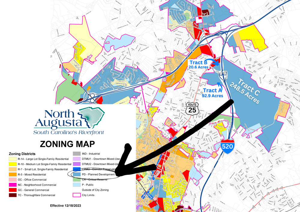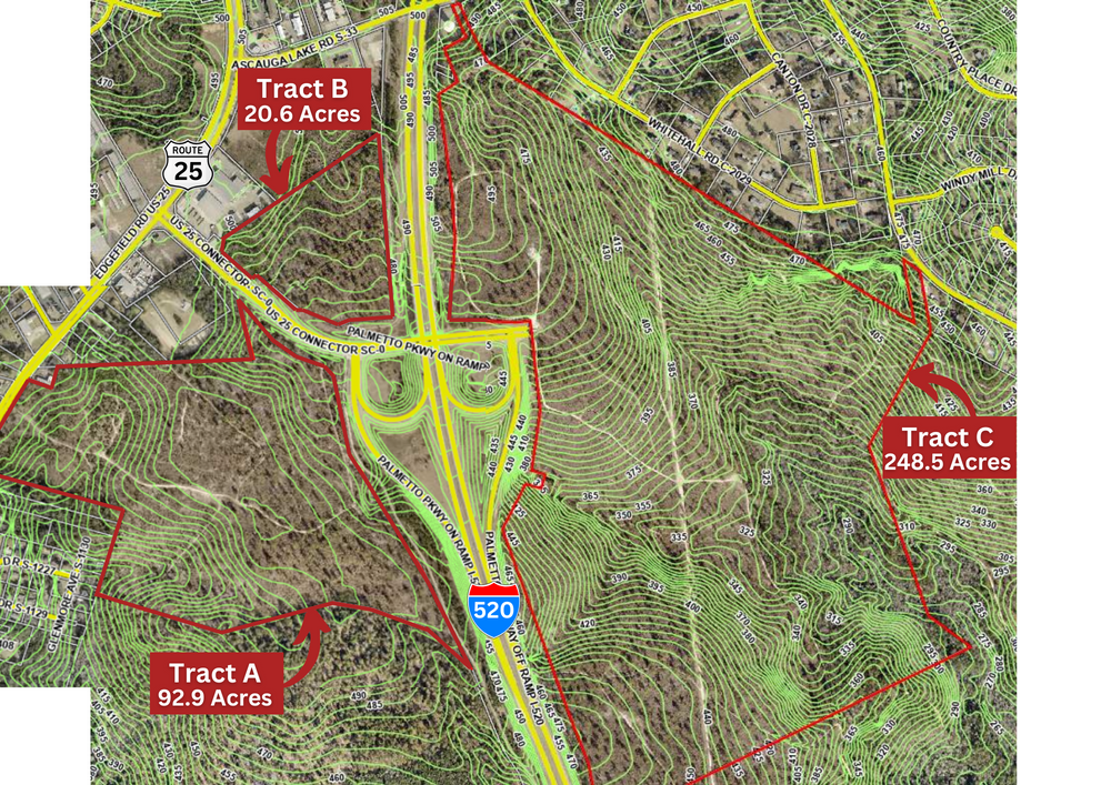 This is a unique opportunity to act as master-developer for a PUD at the intersection of I-520 and I-20 in North Augusta (within City Limits of North Augusta and in Aiken County) SC. A national homebuilder has partnered with the current owner, on 970+acres for the residential buildout, which will total over 3,000 homes once complete. Meybohm Commercial & Wakefield Group are marketing the remaining 362 acres of entitled commercial/mixed-use property, which includes all 4 quadrants of an interstate interchange off I-520. The Development has been called "Highland Springs" for years, but the name will be changed upon completion of NVR’s branding study. The existing entitlements allow for a myriad of uses across the 362 acres, from light-industrial to heavy commercial, retail, town center, and some multi-family. To date we have received inquiries from big-box retail developers, a charter school operator, industrial developers, and convenience/retail developers. Tract C: 248.5 acres that spans all land to the east of the connector. This parcel will serve as the main entrance into the residential development and is entitled for all of the above uses, as well as big-box retail and “village-center” zoning, whereby “residential over retail” is encouraged. This site will need a single temporary lift station installed to pump into an existing force main located east of the property along Whitehall Road. Includes TMS #s: 011-12-04-001 & 022-09-17-001 The homebuilder, NVR/Ryan Homes, has not released its brochure or website on this master-planned community yet, but they are planning to develop up to nine distinct neighborhoods/enclaves within the development with prices ranging from high 200s to over $1 million.